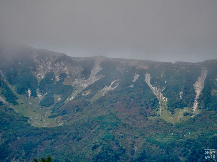 対岸の池山御池をのせた尾根が迫ってカッコよかったが、霧と雲がたえず流れていて、一瞬しか見えなかった。1時間ほど晴れ待ちしたが、全貌は見渡せなかった。