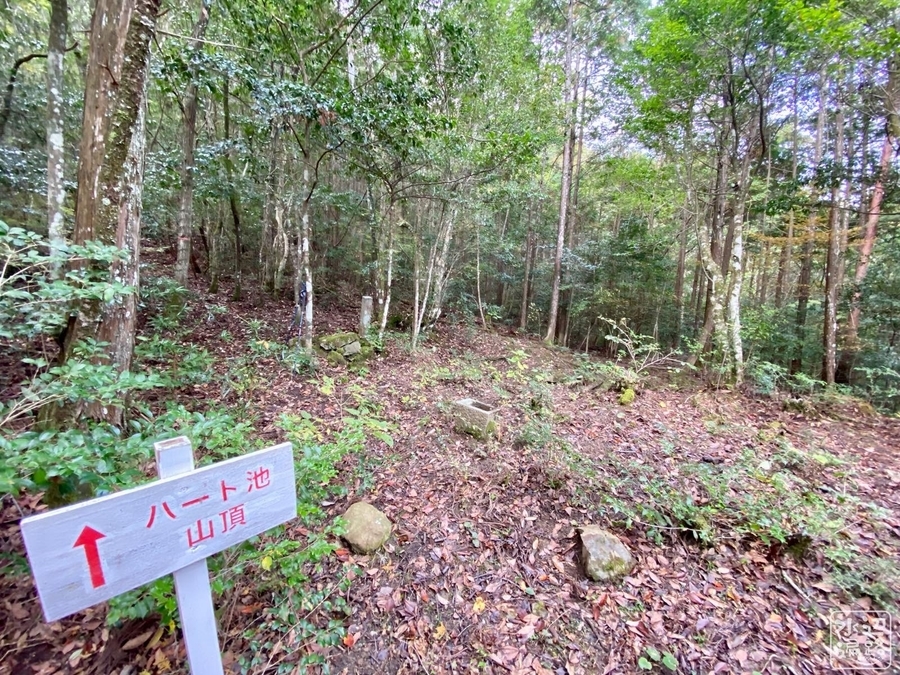 本殿を過ぎてから、ようやく「ハート池」の道標が出てきた。基本的には山頂まで登る感じ。道はところどころ見誤りやすいのでピンクテープを確認しながら。