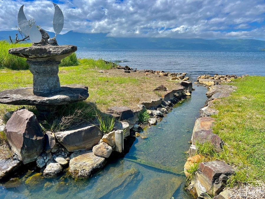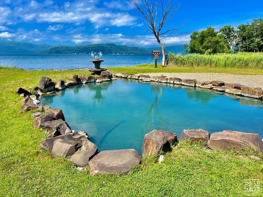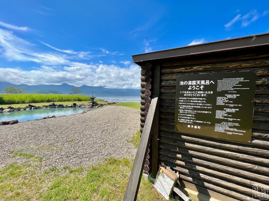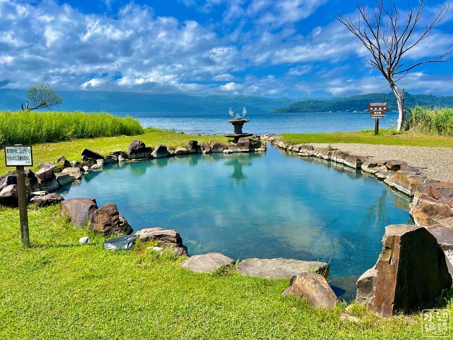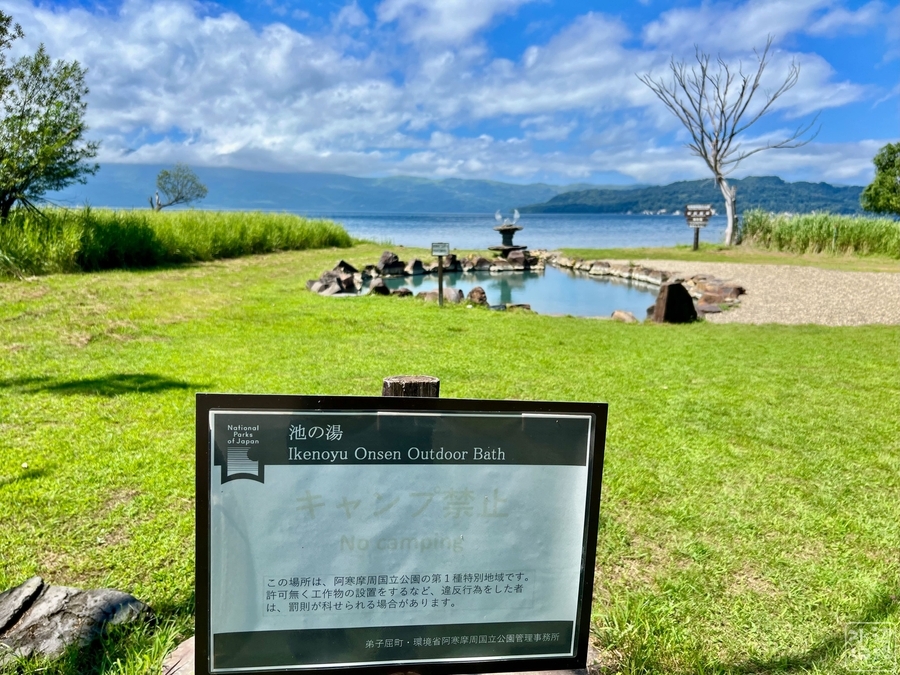 この無料で24時間利用可能の温泉池、目の前に広がっているのは、なんと日本一大きなカルデラ湖。細い水路でつながって排水されている。その名も、池の湯温泉。