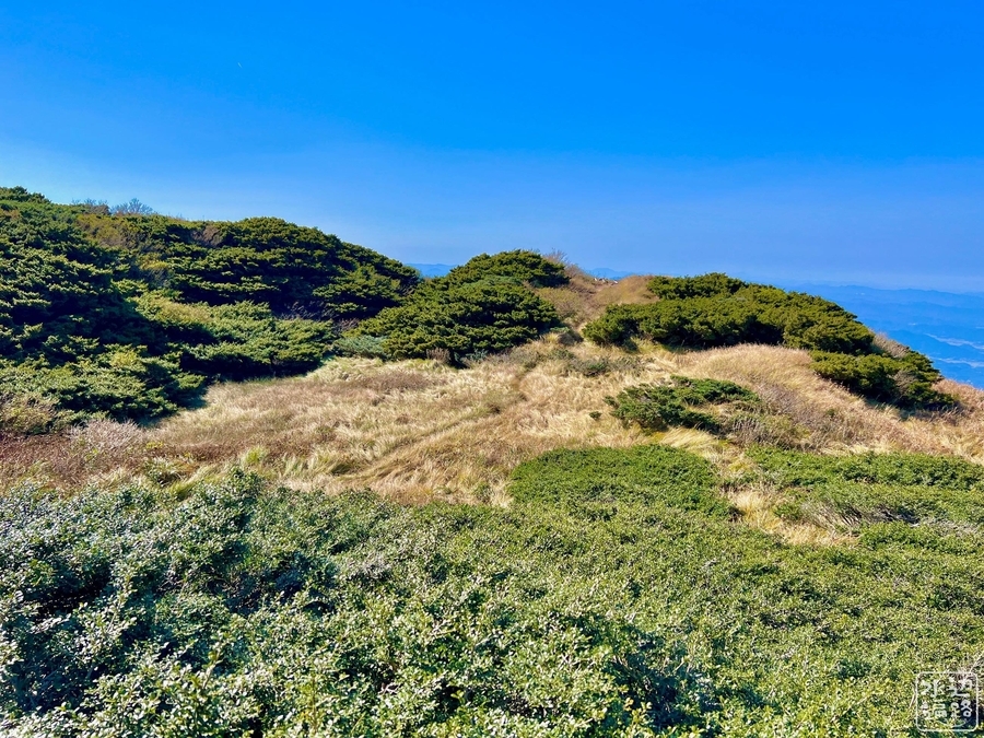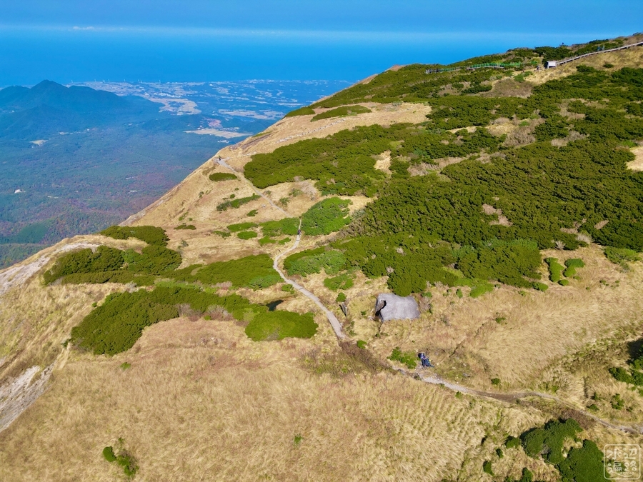 下の写真中央の右下あたりに石室(灰色の石)があり、その右下に地蔵ヶ池の水面が光っているのが見える。