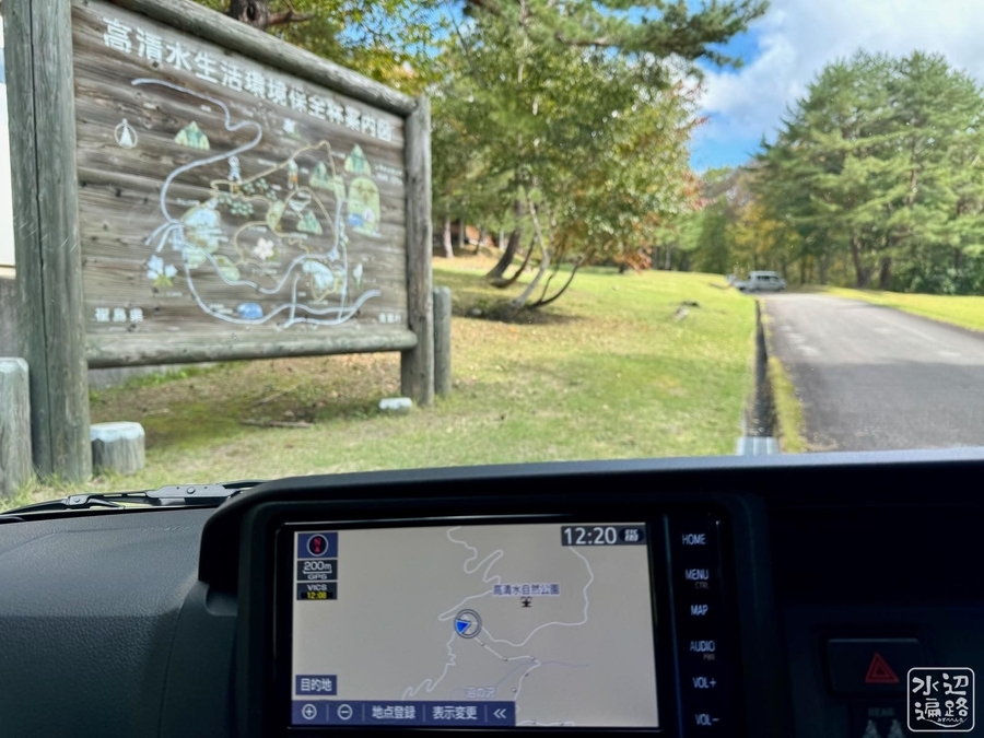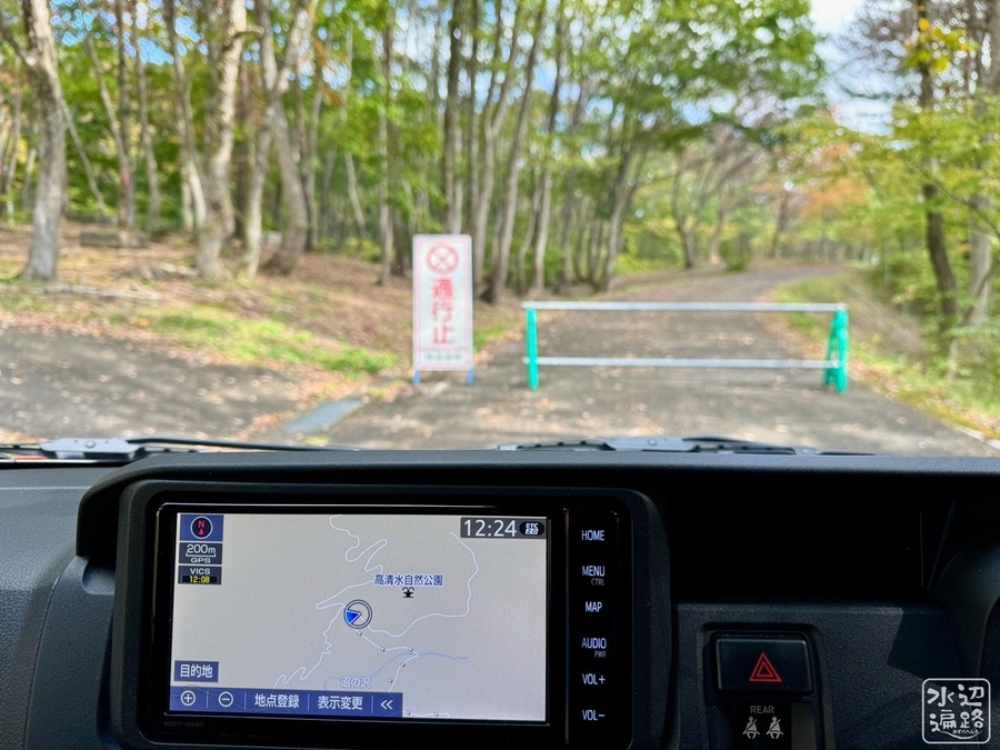 池はひめさゆり群生地となっている高清水自然公園駐車場からのびる林道沿いにあるが、駐車場から先はゲートがあり「通行止め」の看板が。池までは徒歩およそ2km。