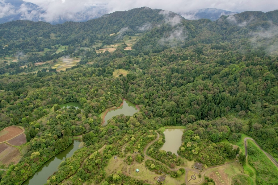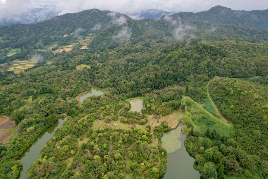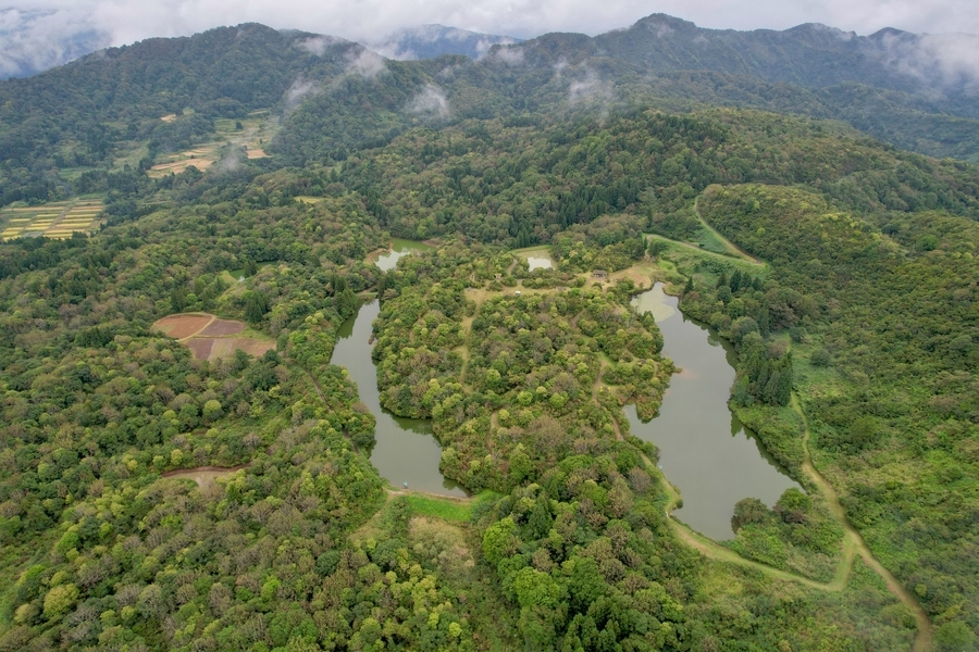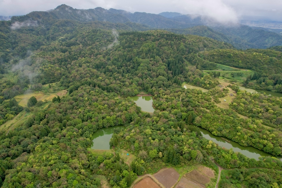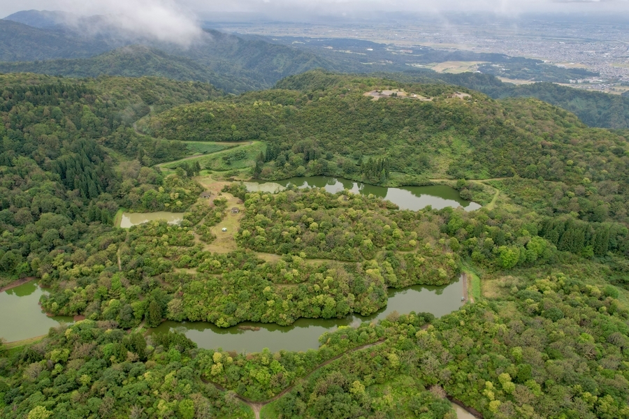 長岡市八方台いこいの森というキャンプ場の借景要素になっている池が山の中腹に肩を寄せ合っている。柳市池、柳池、長池ともうひとつの池の合わせて四つ。