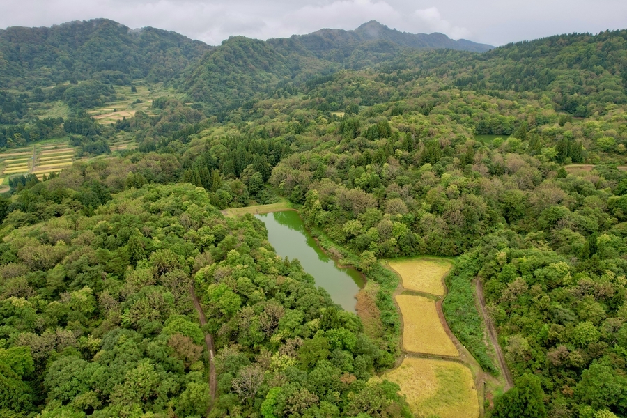 池自体は農業用の溜め池と思われるが、地図で見るとその布陣がちょっと変わっていたので空撮で状況を確認した。