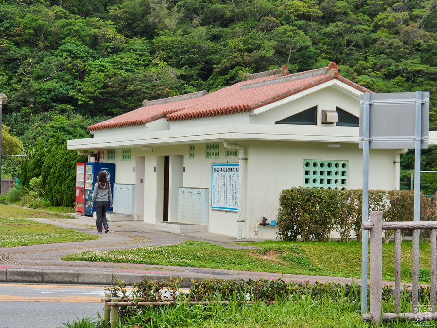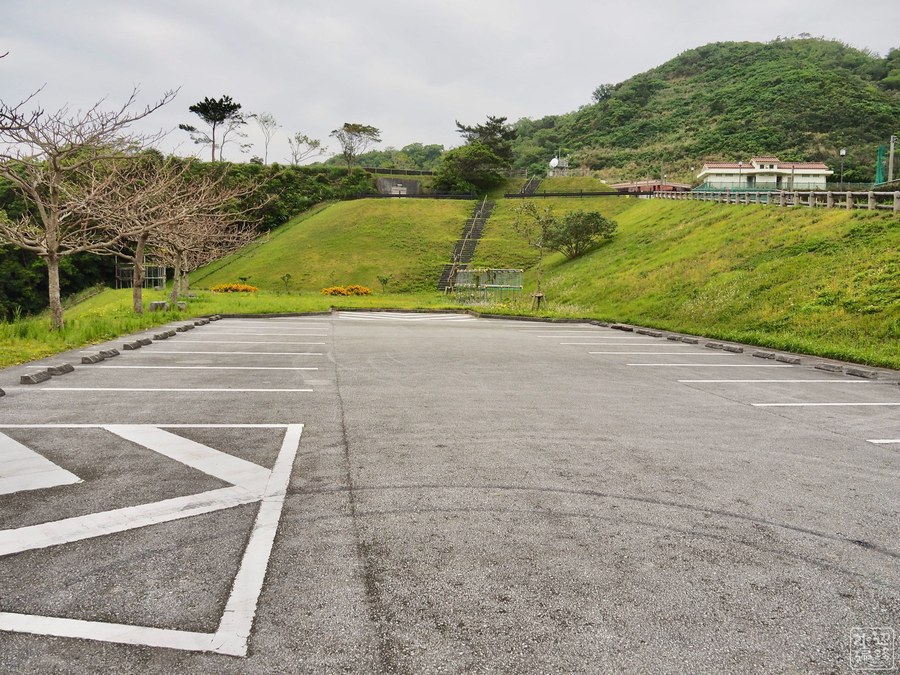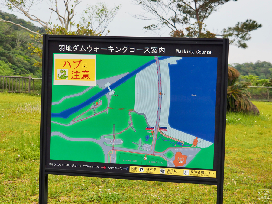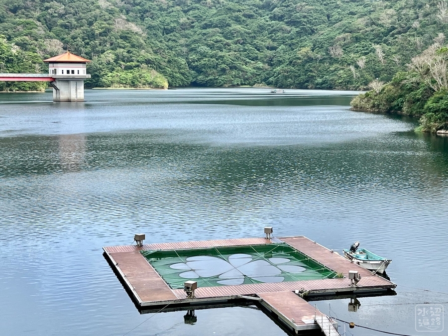 沖縄赤瓦テイストで管理塔、トイレ、取水塔などの設備の屋根が統一されているのが沖縄のダムのこだわりポイント。