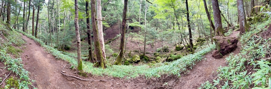 やや切り立っており溶岩がゴロゴロ。後背に三岳を控えるだけに噴火活動の影響が見てとれる。