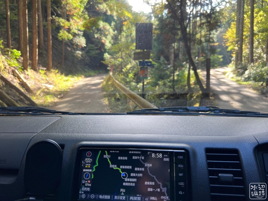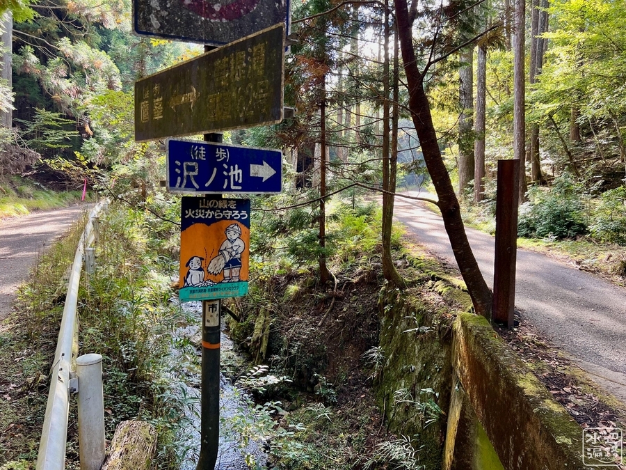 川沿いの舗装林道が池まで通じる