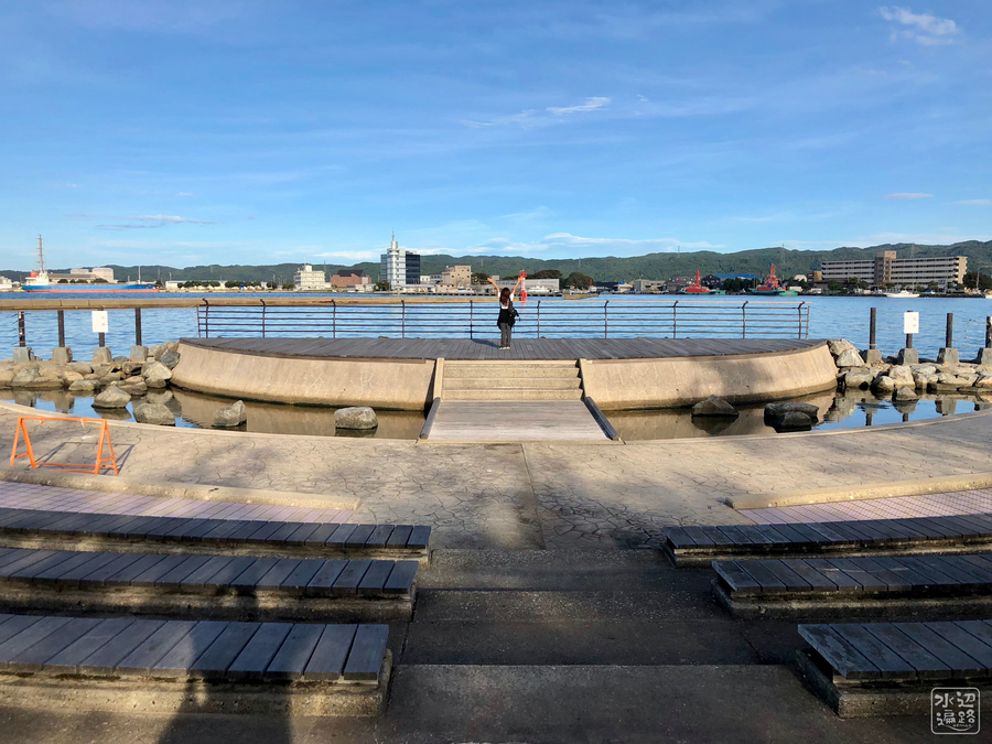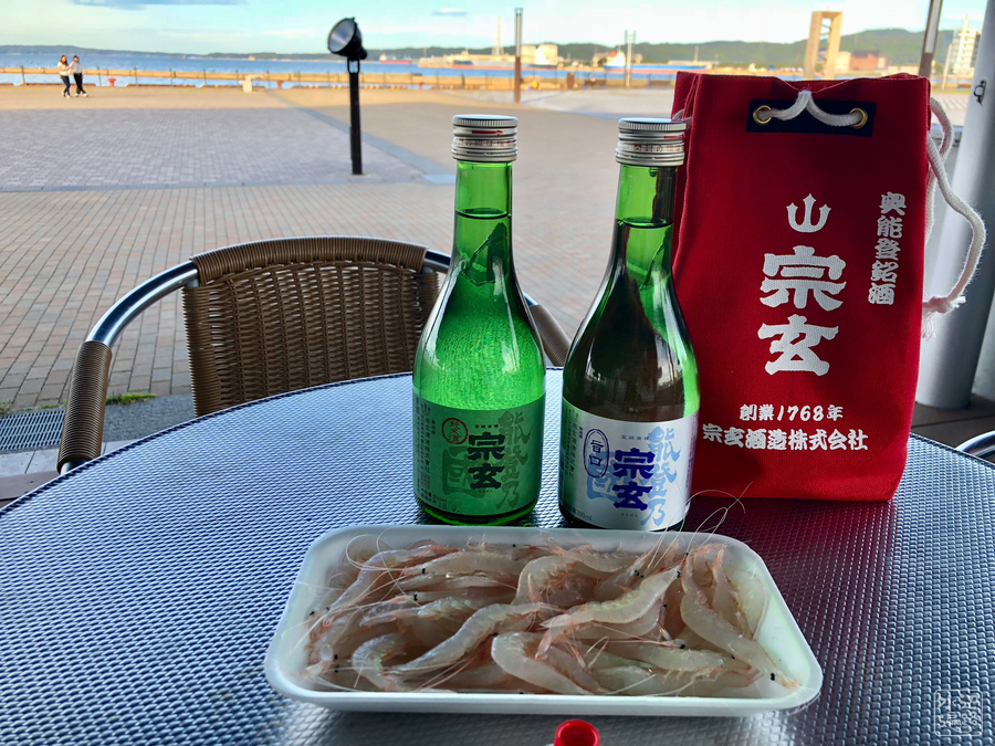 海が目の前の道の駅である。半ドーナツ型の池は両端が海と通水しているので干満の影響も受けそう。池と海を見ながら食祭市場で買った特産の白エビをいただいた。