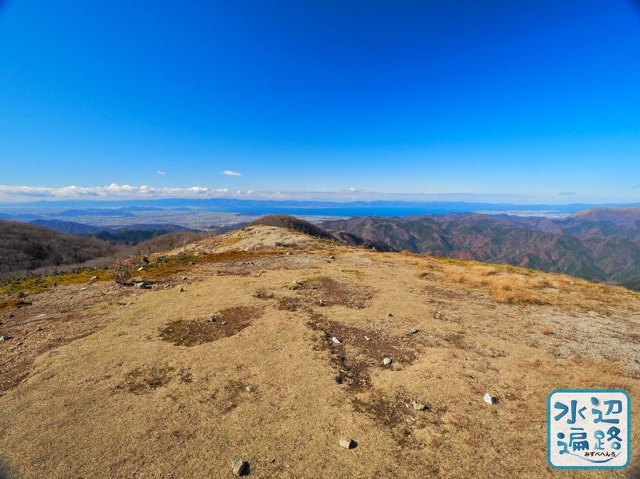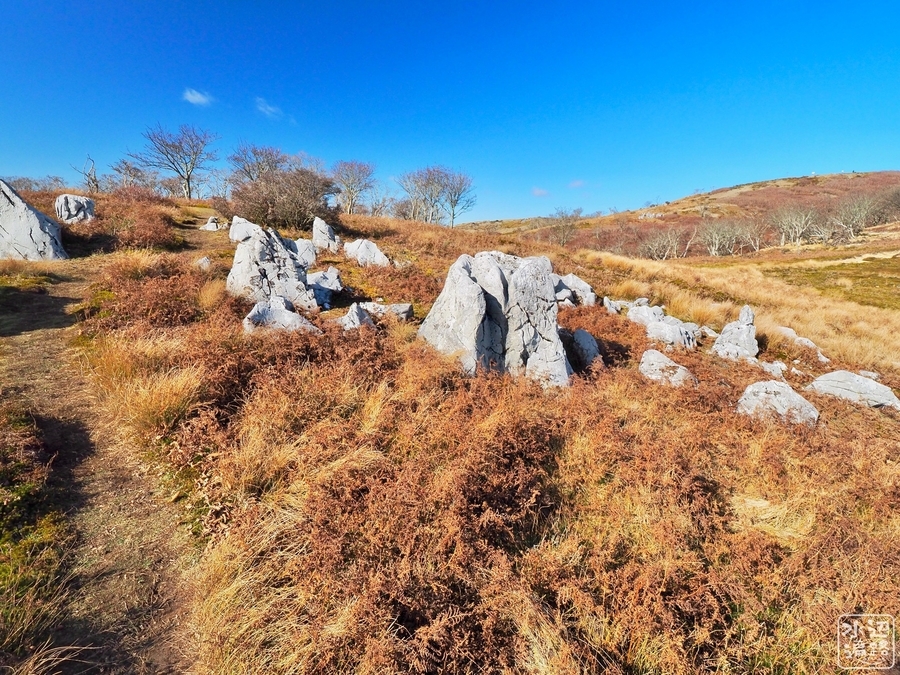 御池岳の山頂は闊達な高原台地になっており、膝下ぐらいの草原のところどころに墓標のように岩群が立つカルスト地形だ。昔は笹原で見通しがきかなかったというが、火事でこのような姿になったというからケガの功名か。