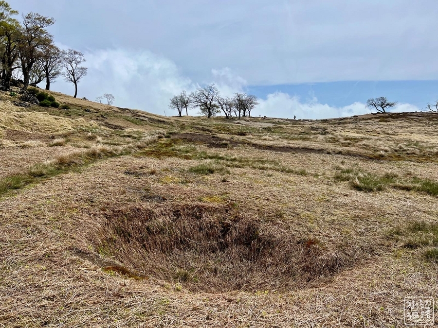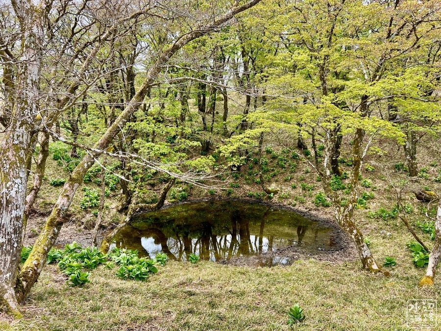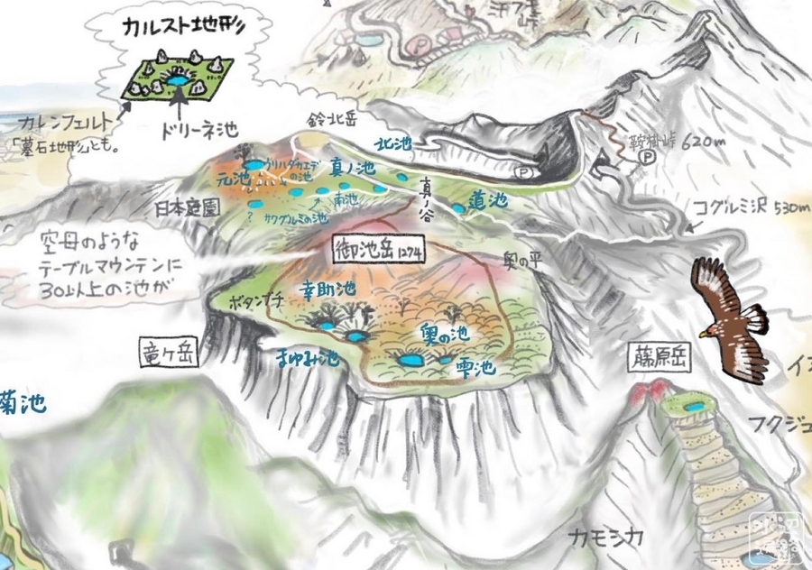 「テーブルランド」と呼ばれる山頂高原には、登山地図に出ている真の池と元池の二池のほかにも、ドリーネ池が多数あるという。
