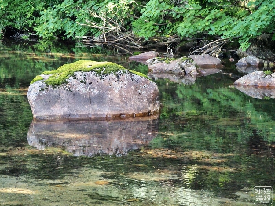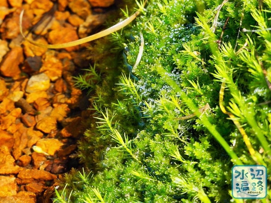 苔類と赤っぽい礫が岸を形成。水位は安定しているようだ。
