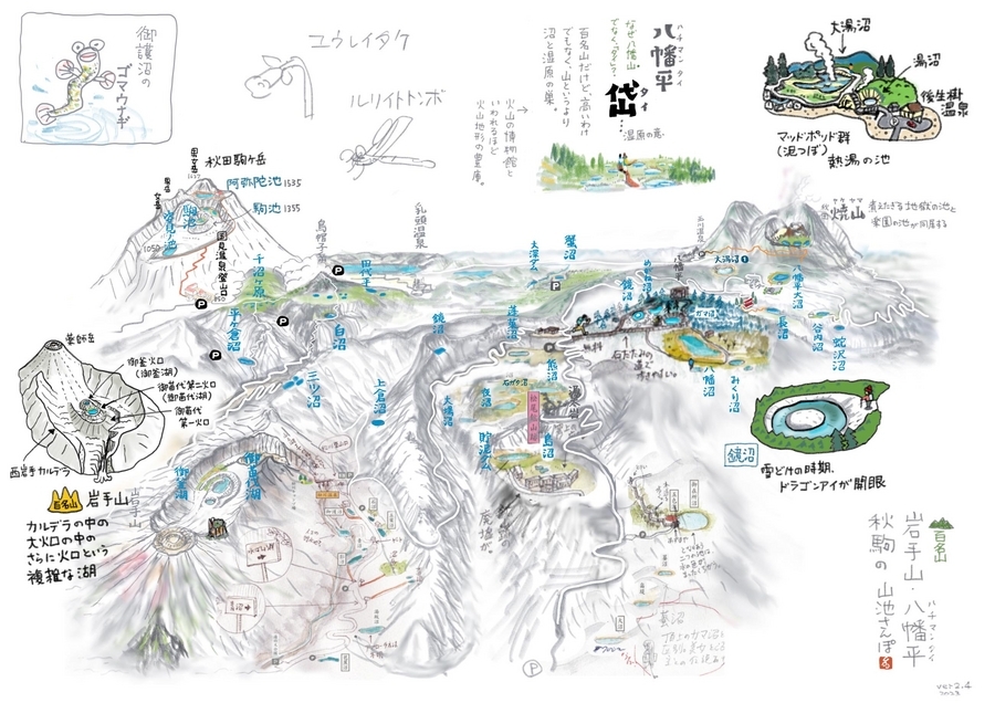 西岩手カルデラ内にあるのでカルデラ湖と混同した記述なども見られるが、正しくは火口湖である。カルデラの中にある火口湖については赤城山のページに池マンガで解説した。