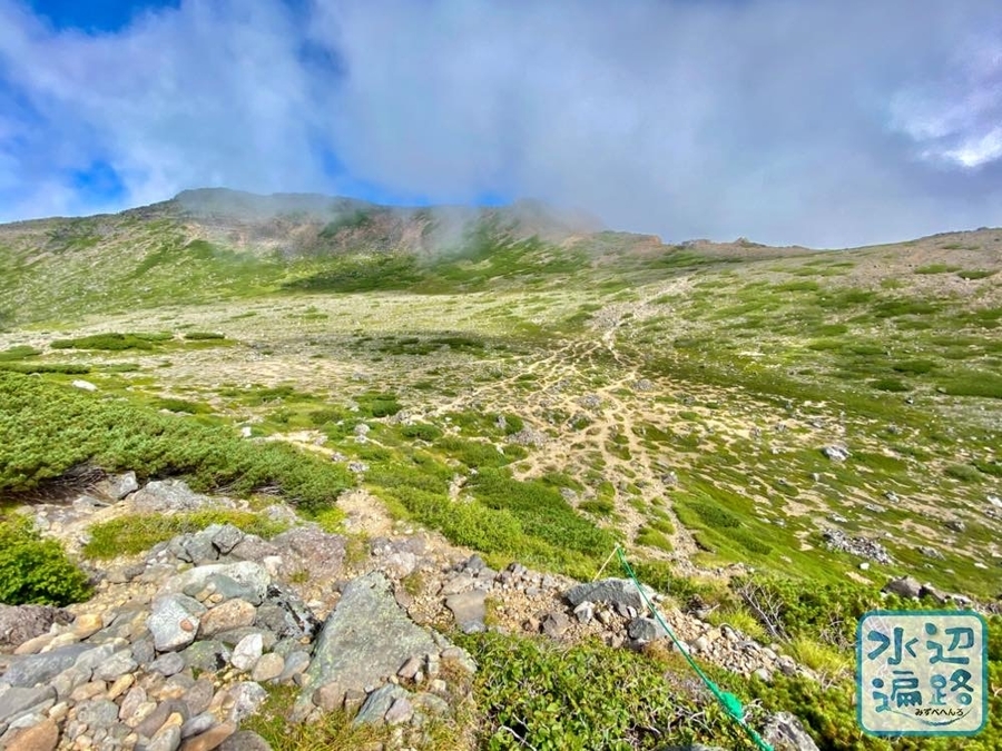 上の写真では山小屋(五ノ池小屋)の手前に見えるくぼみの部分が五ノ池。かつては常時湛水した池だったが、現在は減水状態、あるいは雨後に湛水する状態になっているようだ。