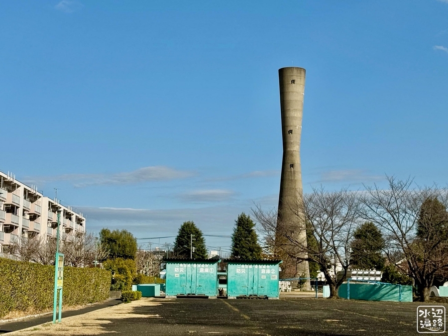 2025-01-11 多摩川住宅給水塔(東京都狛江) 東京都 「杵(きね)」の形をした給水塔が五本。 対岸から見ると五本の杵が立ち並ぶ姿を見ることができるというが、絶好のビュースポットを探すのが難しい。 下の写真では四本の給水塔が見えるが、一番左のものは円盤型の都営染地三丁目アパート給水塔。 向こうにも同型の給水塔が見える 配水池に関する記事 2024年4月発行の「地方公務員 安全と健康フォーラム」127号に掲載。 www.jalsha.or.jp
