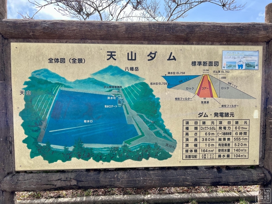 ロックフィルダムを主堤に副堤複数で山の頂(いただき)に嵌め込まれた宝石のような湖面を現出。