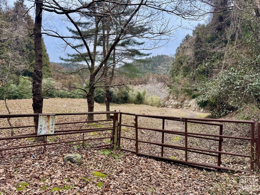 アプローチ路入口にゲートと関係者以外立入禁止の看板あり。アプローチ路は1.5車線の舗装林道。