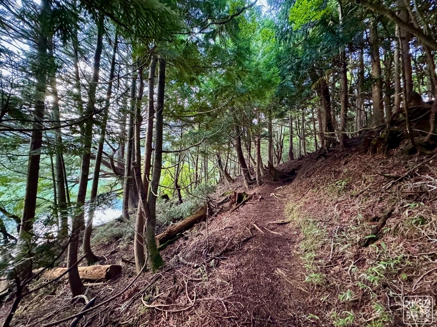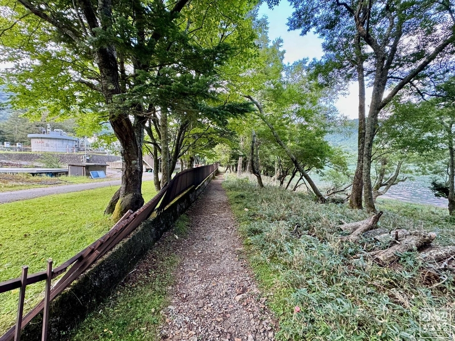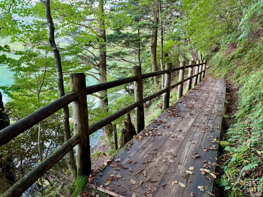 西岸側は山が湖まで迫り、遊歩道も湖面と比高がある。