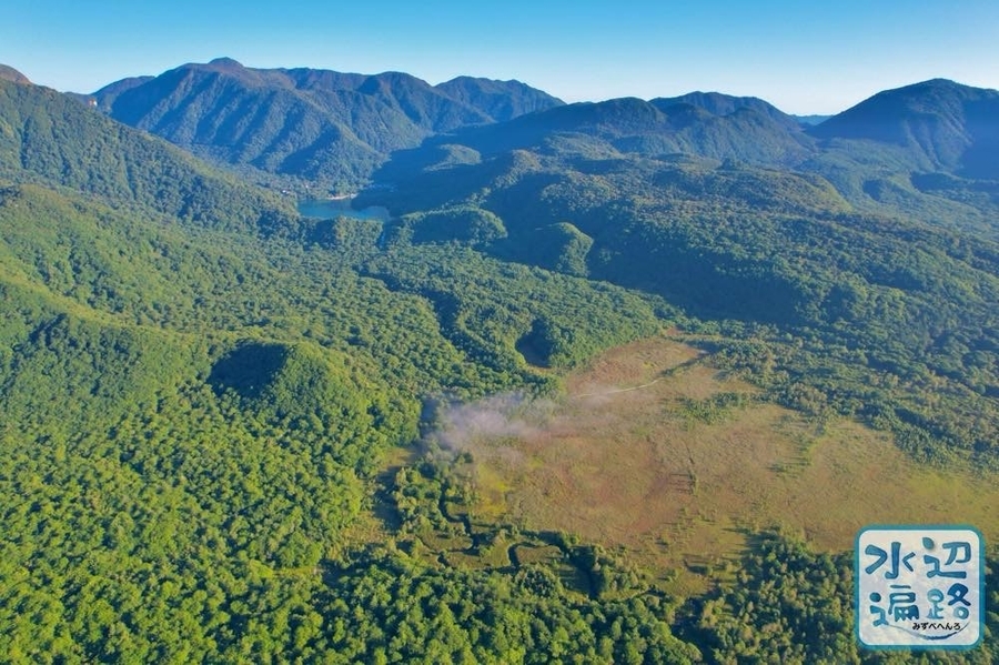 吐き出し側となる湯ノ滝も見える。このアングルでは湯ノ滝と湿原との高低差がよく分かる。(2024年)