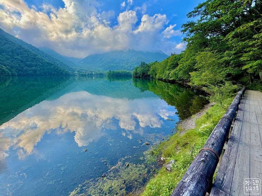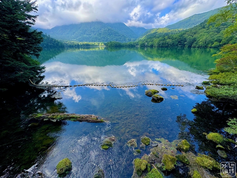 温泉がせせらぎとなって流れ込んでいるため、湖口近くは湯気が立ちこめ、幻想的な水の色を見せる。