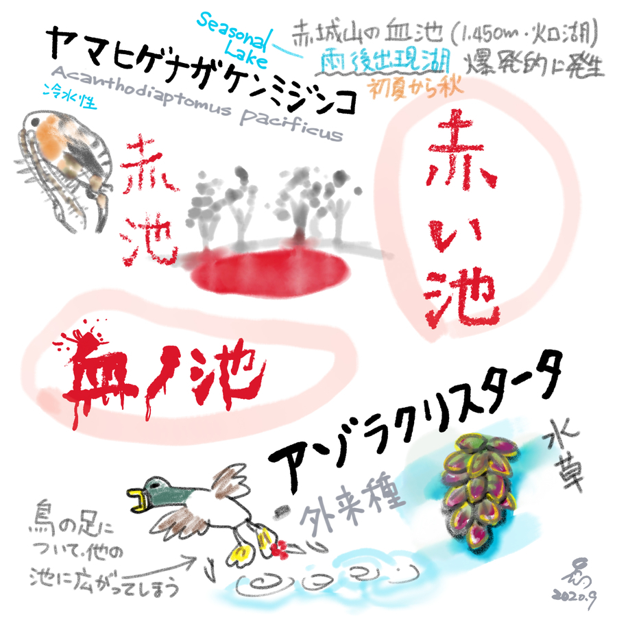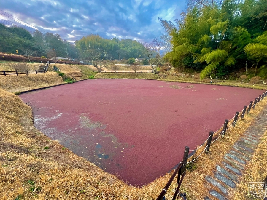 公園内の鑑賞池はアゾラクリスタータという赤い水生植物で埋めつくされて真っ赤な水面に。隣の池はふつうに緑の水だけに対比がすごい。